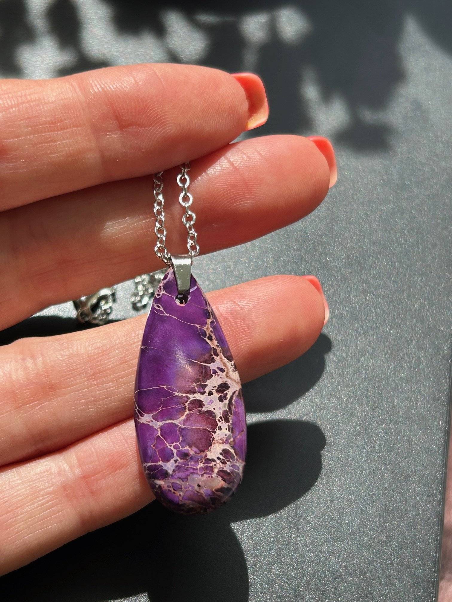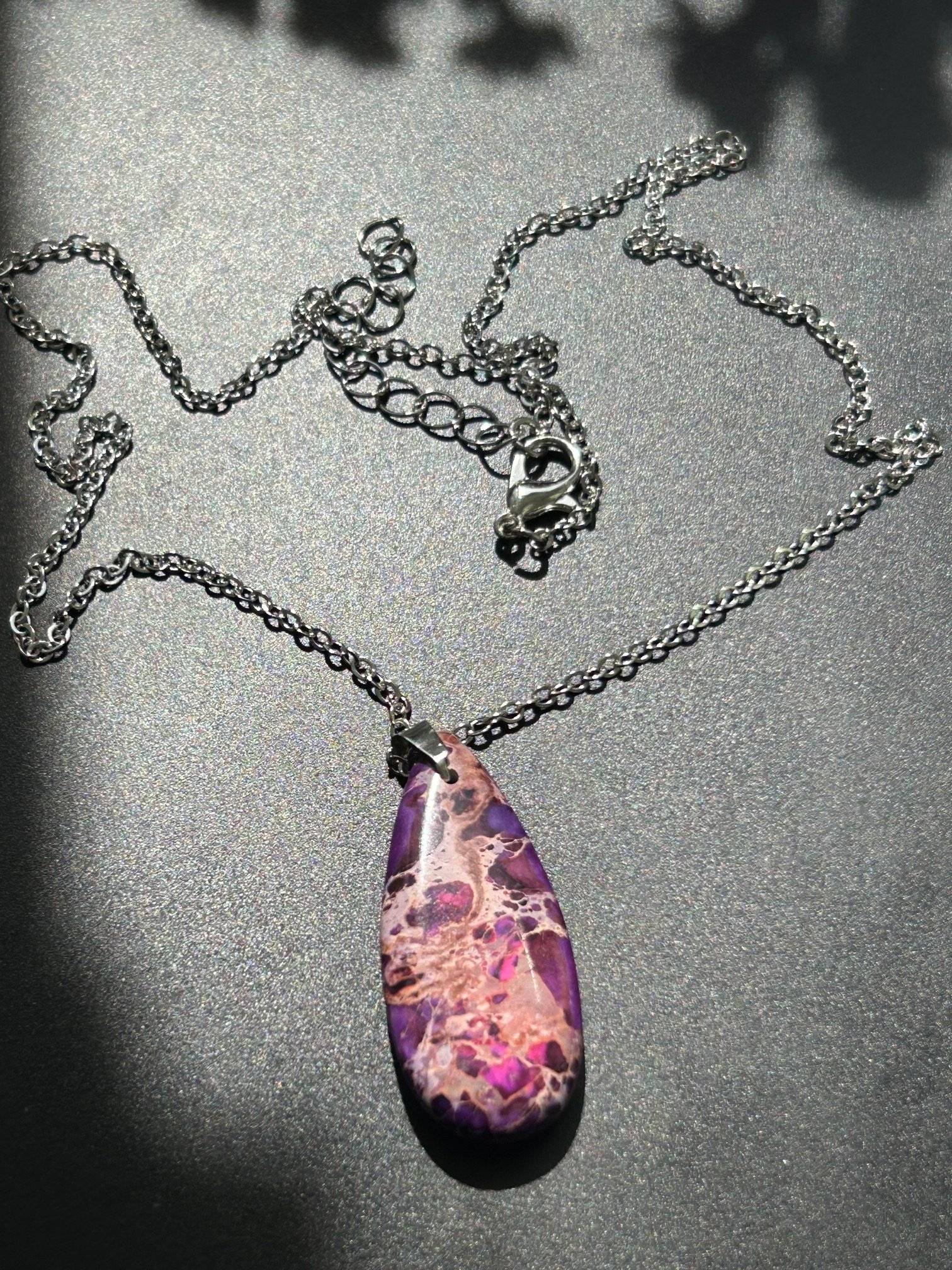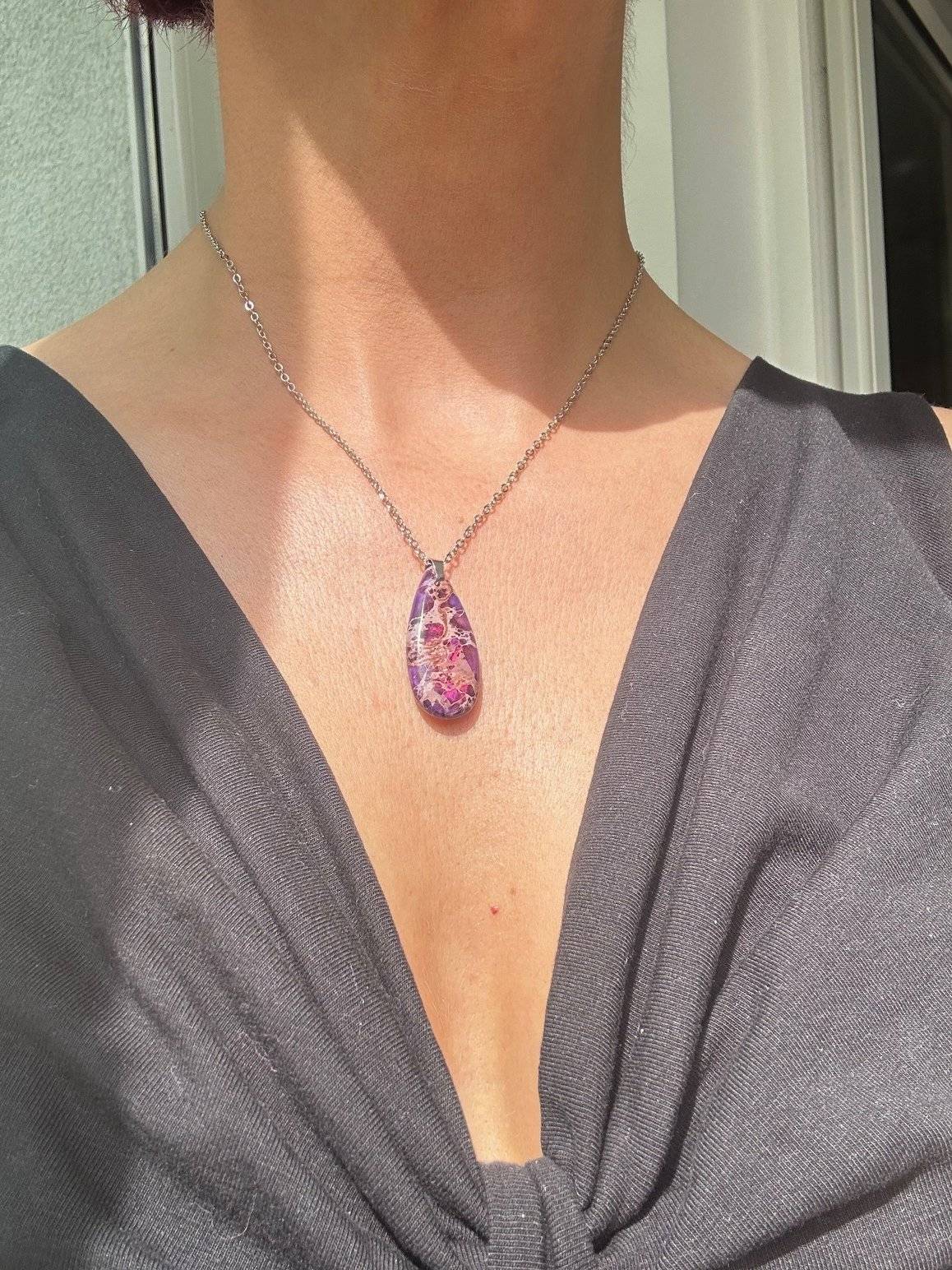 Pandantiv picătură din jasp imperial, dimensiune 35x15mm cu lănțișor argintiu.