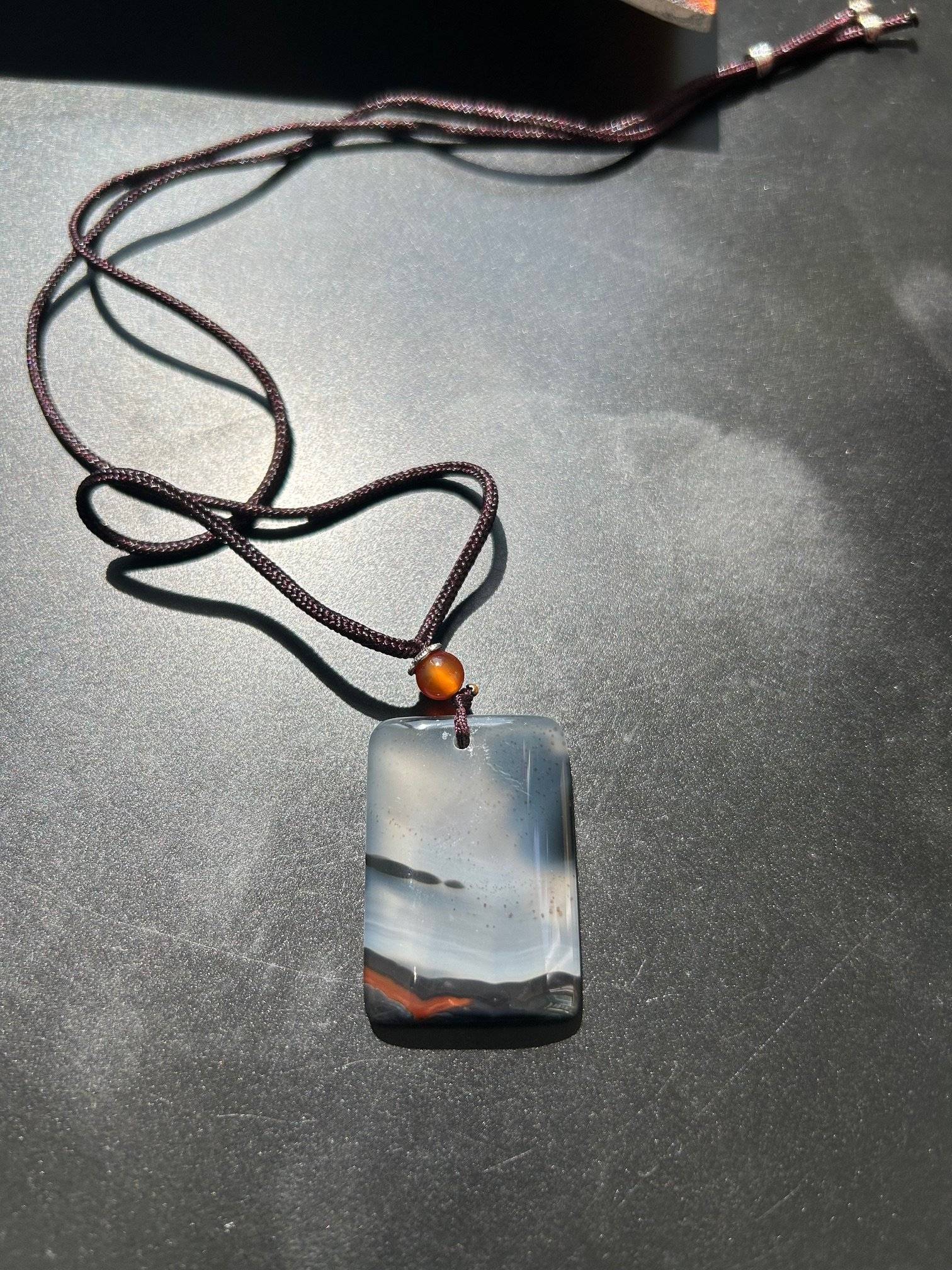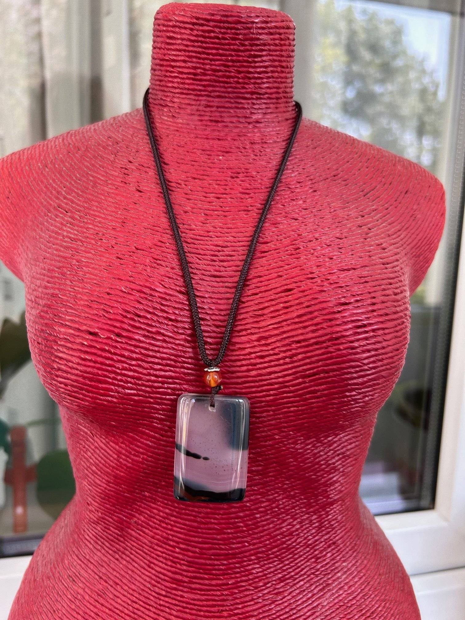 Pandantiv din piatră naturală - agat cenușiu - secțiune cu grosimea de 5 mm, cu suprafață netedă-lucioasă, cu dimensiuni de cca. 30x25 mm. Dispune de șnur textil reglabil după preferință, lungime maximă 60 cm.