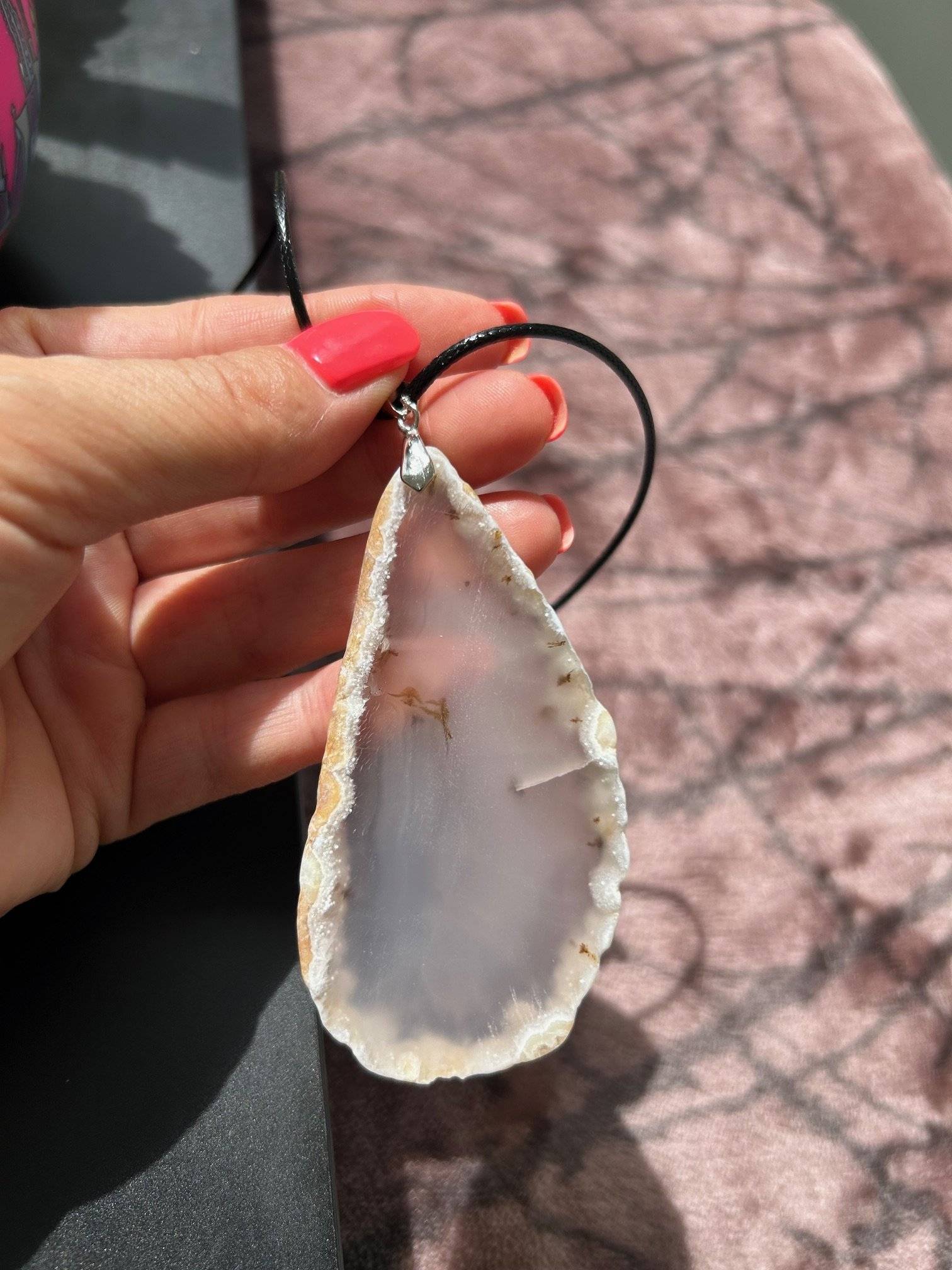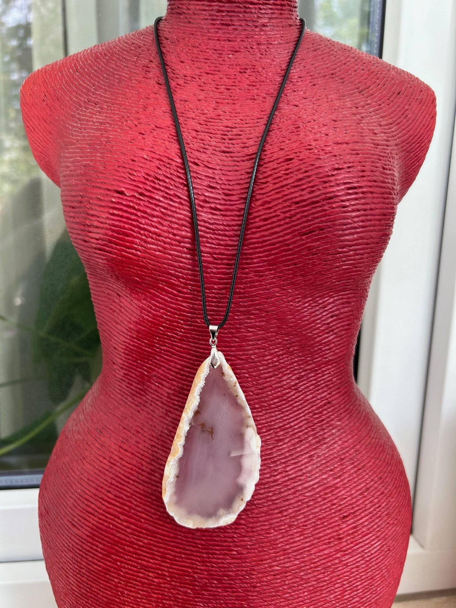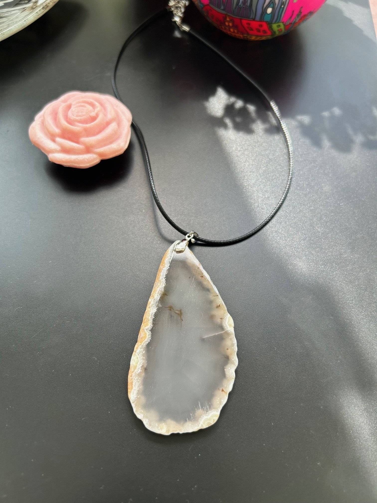 Pandantiv absolut fermecător din piatră naturală - agat cenușiu - secțiune cu grosimea de 5 mm, cu margini zimțate și suprafață netedă-lucioasă, cu dimensiuni de cca. 60x45 mm. Se livrează cu șnur cerat cu lungimea de 45 cm și grosimea de 1,5mm.