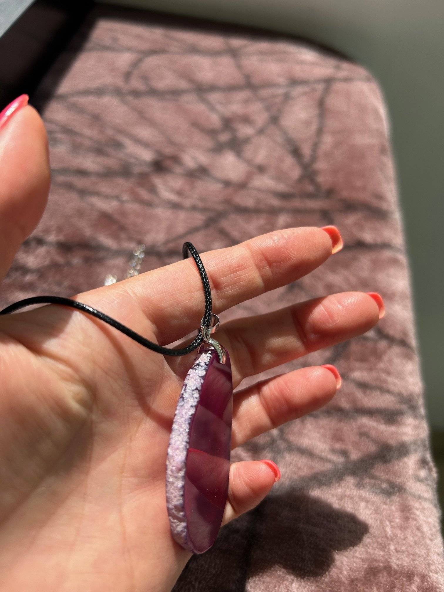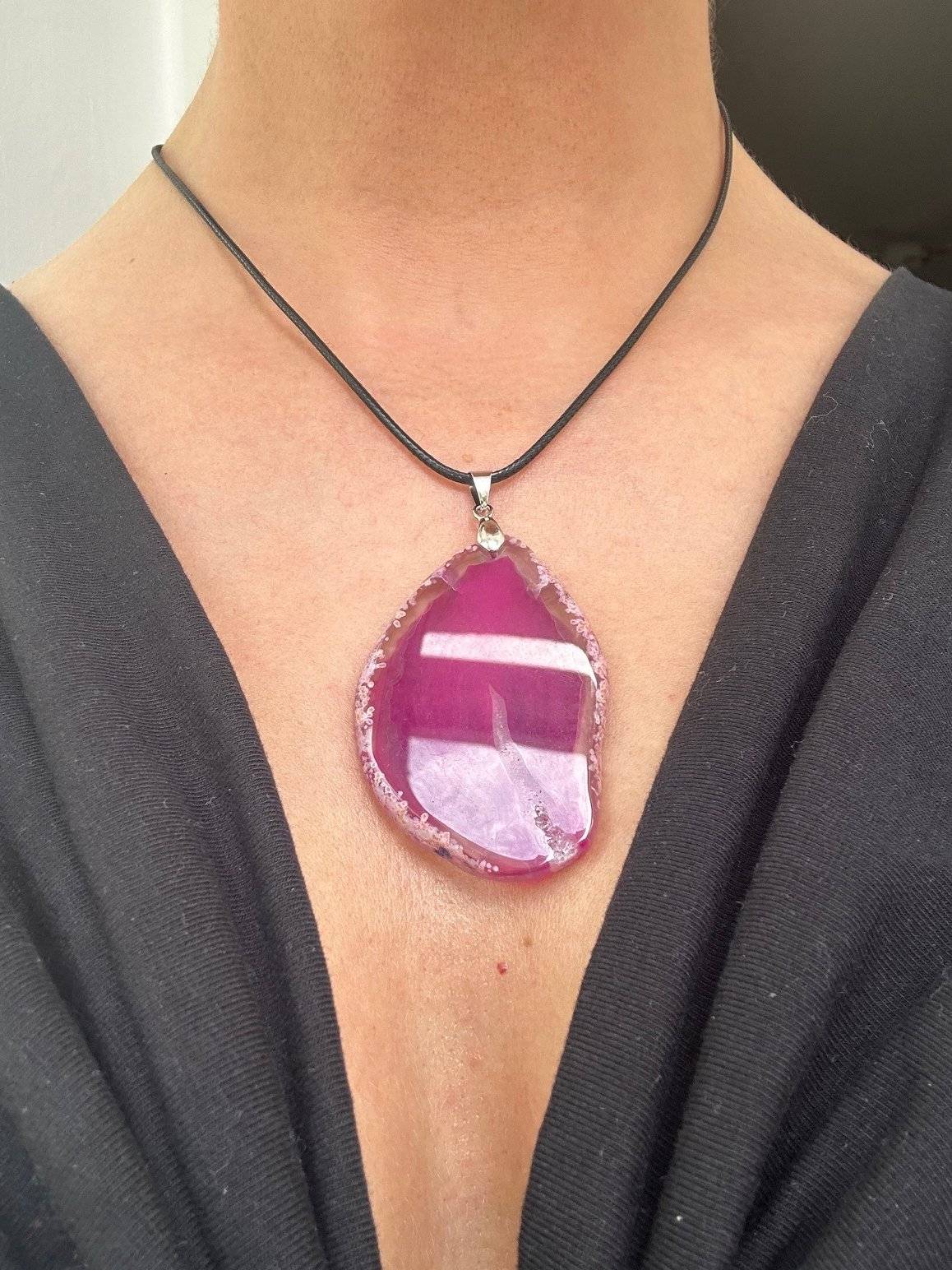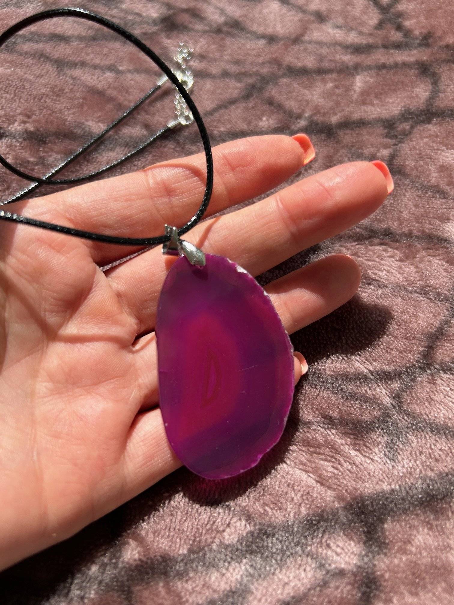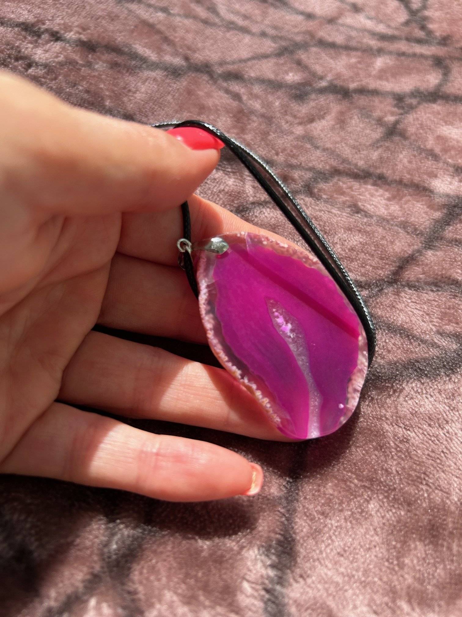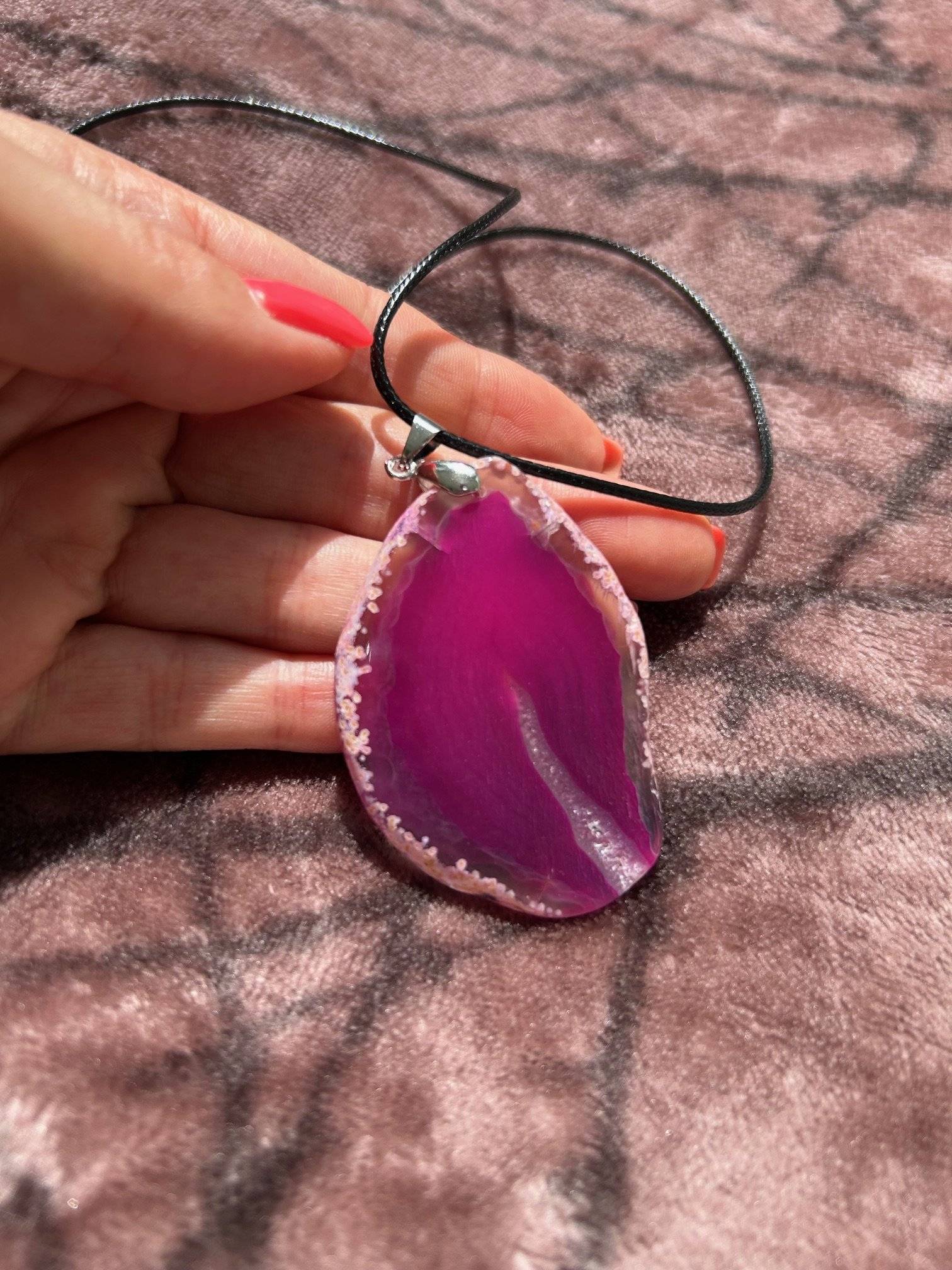 Pandantiv absolut superb din piatră naturală - agat trandafiriu - secțiune cu grosimea de 5mm, cu margini zimțate și suprafață netedă-lucioasă, cu dimensiuni de cca. 60x35 mm. Se livrează cu șnur cerat cu lungimea de 45 cm și grosimea de 1,5 mm.
