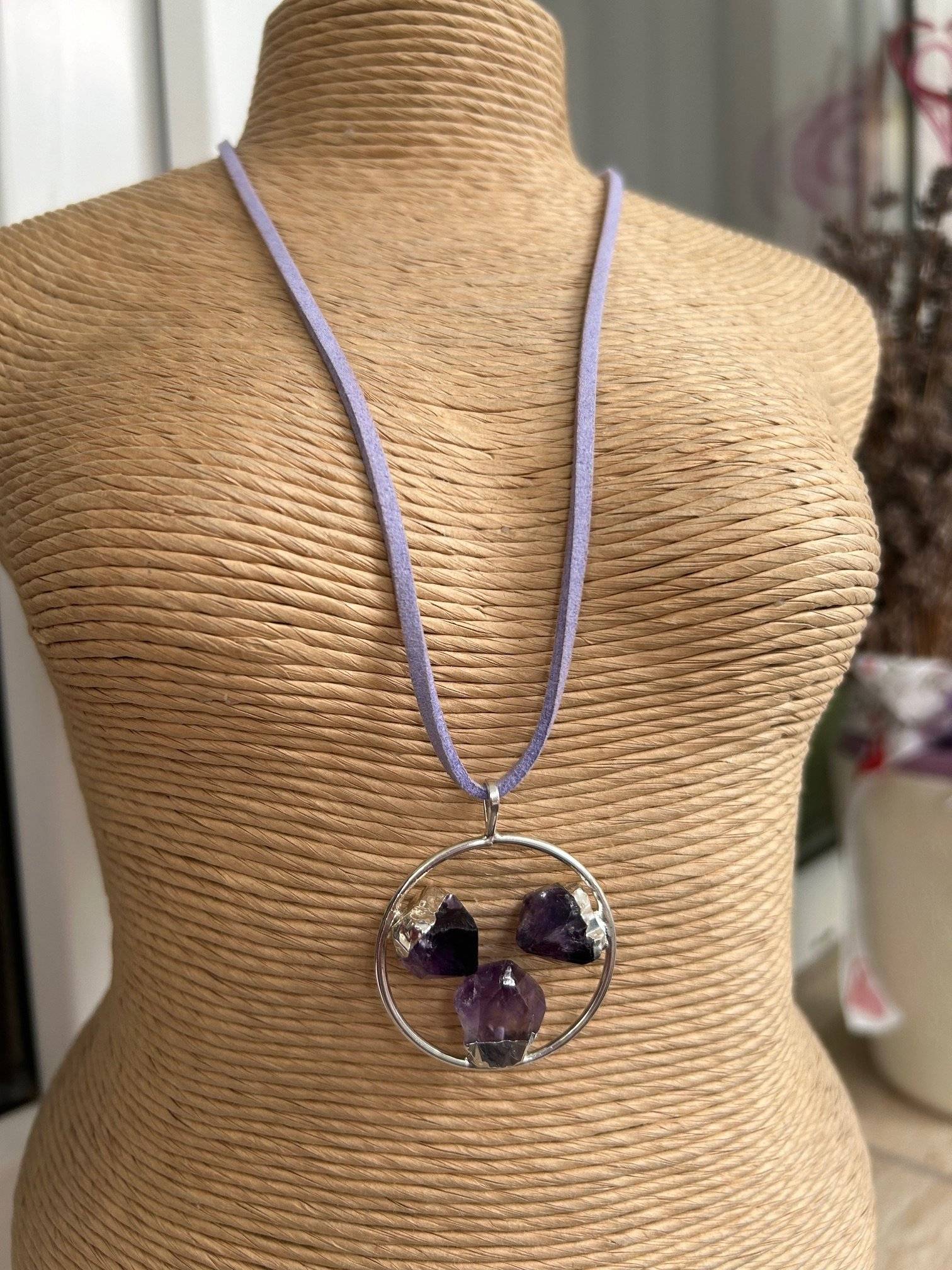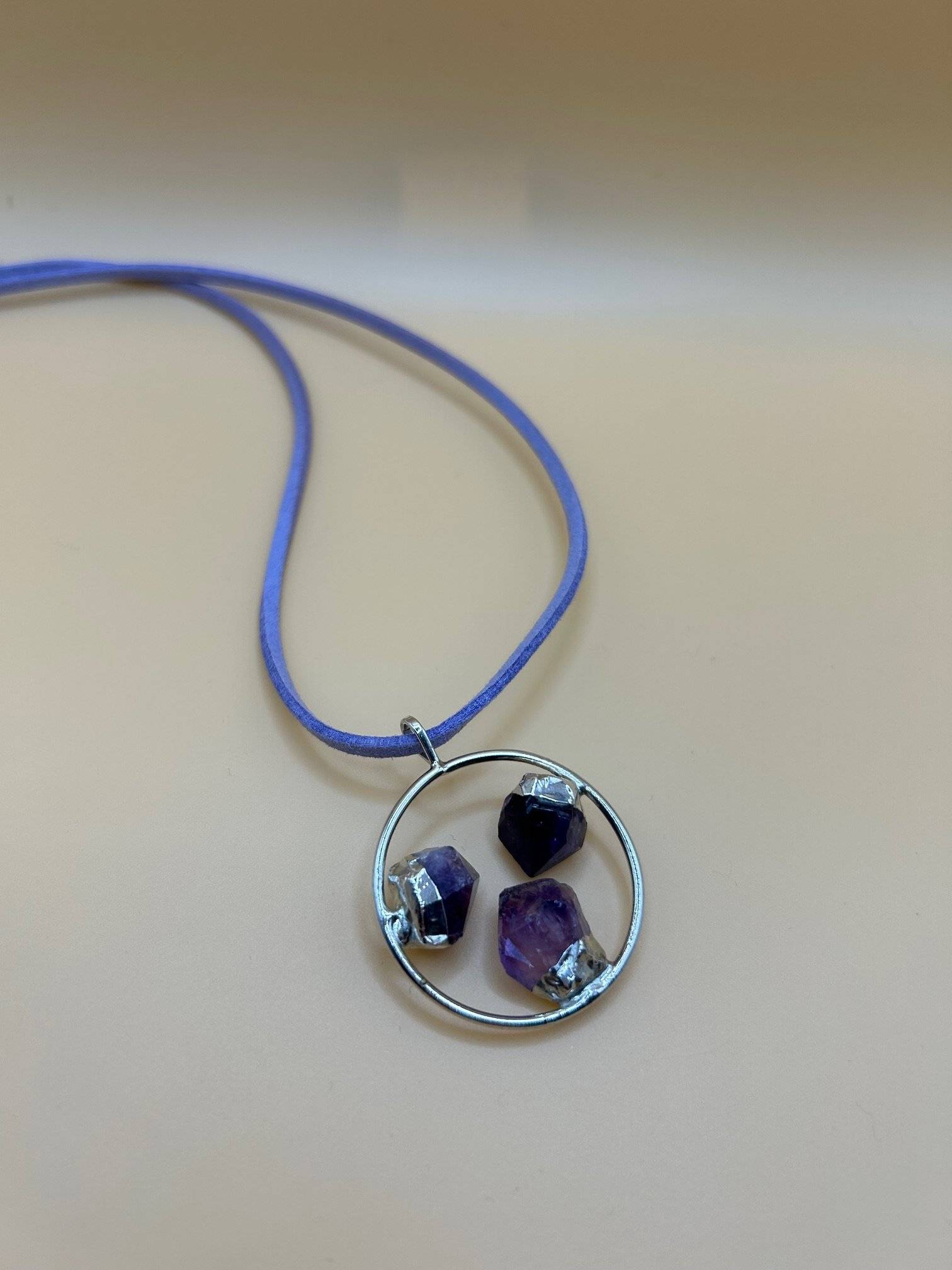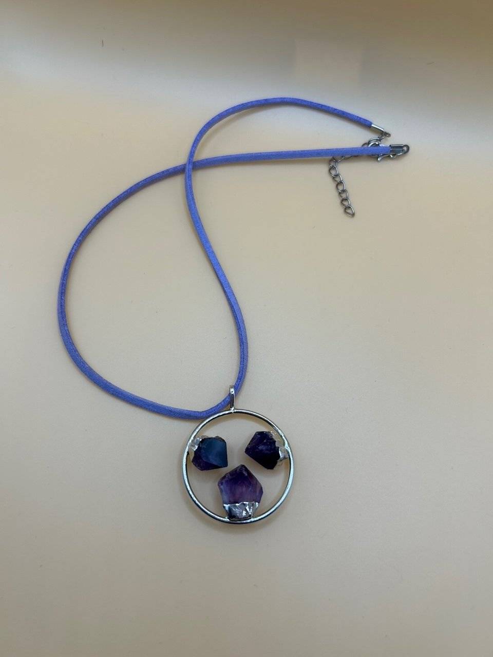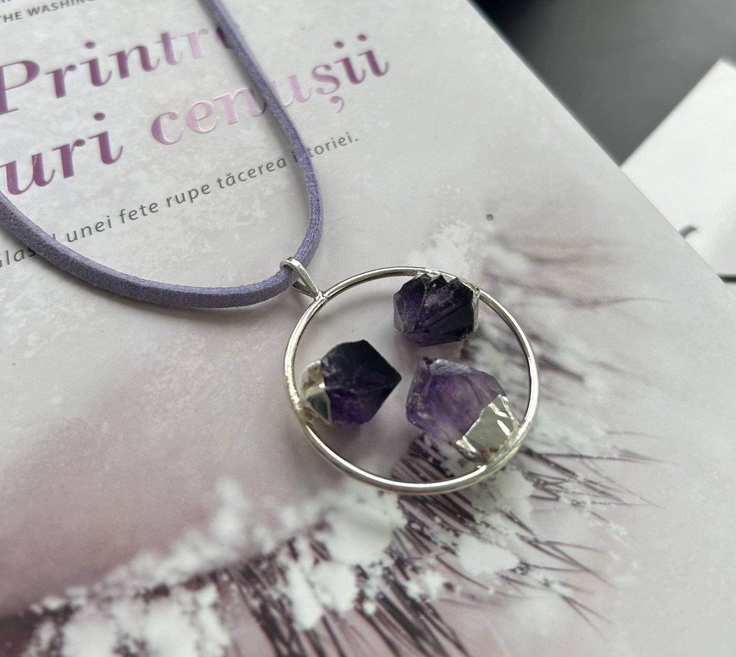 Vă prezentăm un superb pandantiv cerc din argint cu montura de trei cristale ametist, diametrul cca. 30 mm, cu șnur din piele lila cu închizătoare și lanț prelungitor. Lungimea șnurului este de 45 cm, grosime 1,5 mm.