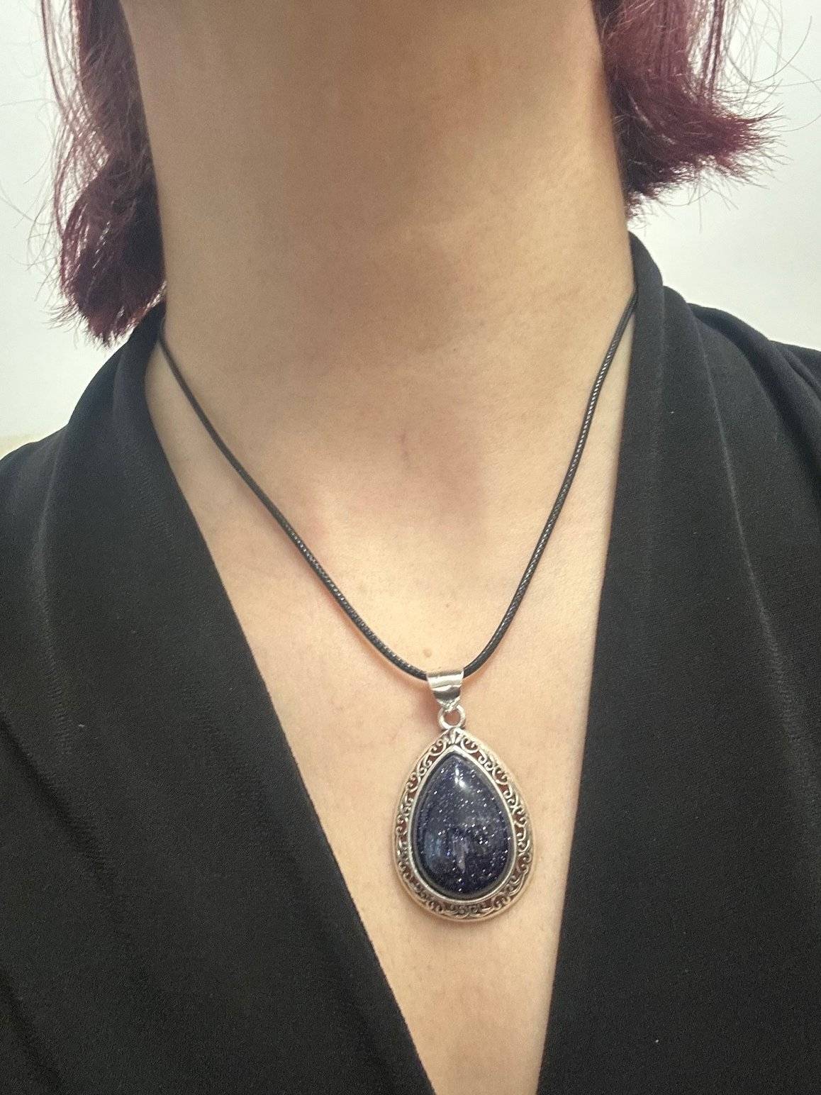 Pandantiv în formă de lacrimă, confecționat din oțel inoxidabil și piatră semiprețioasă sintetică PIATRA SOARELUI ALBASTRĂ.