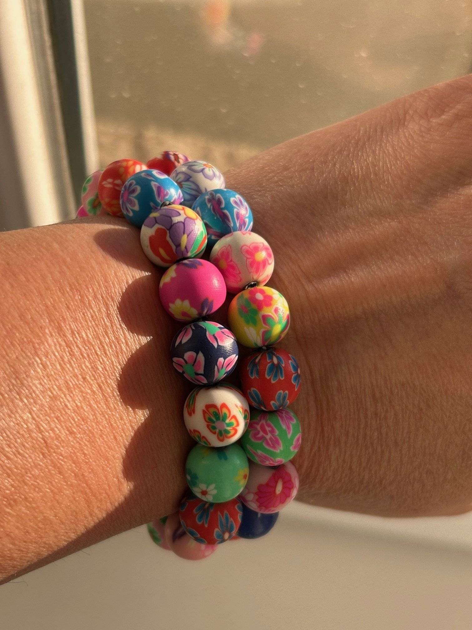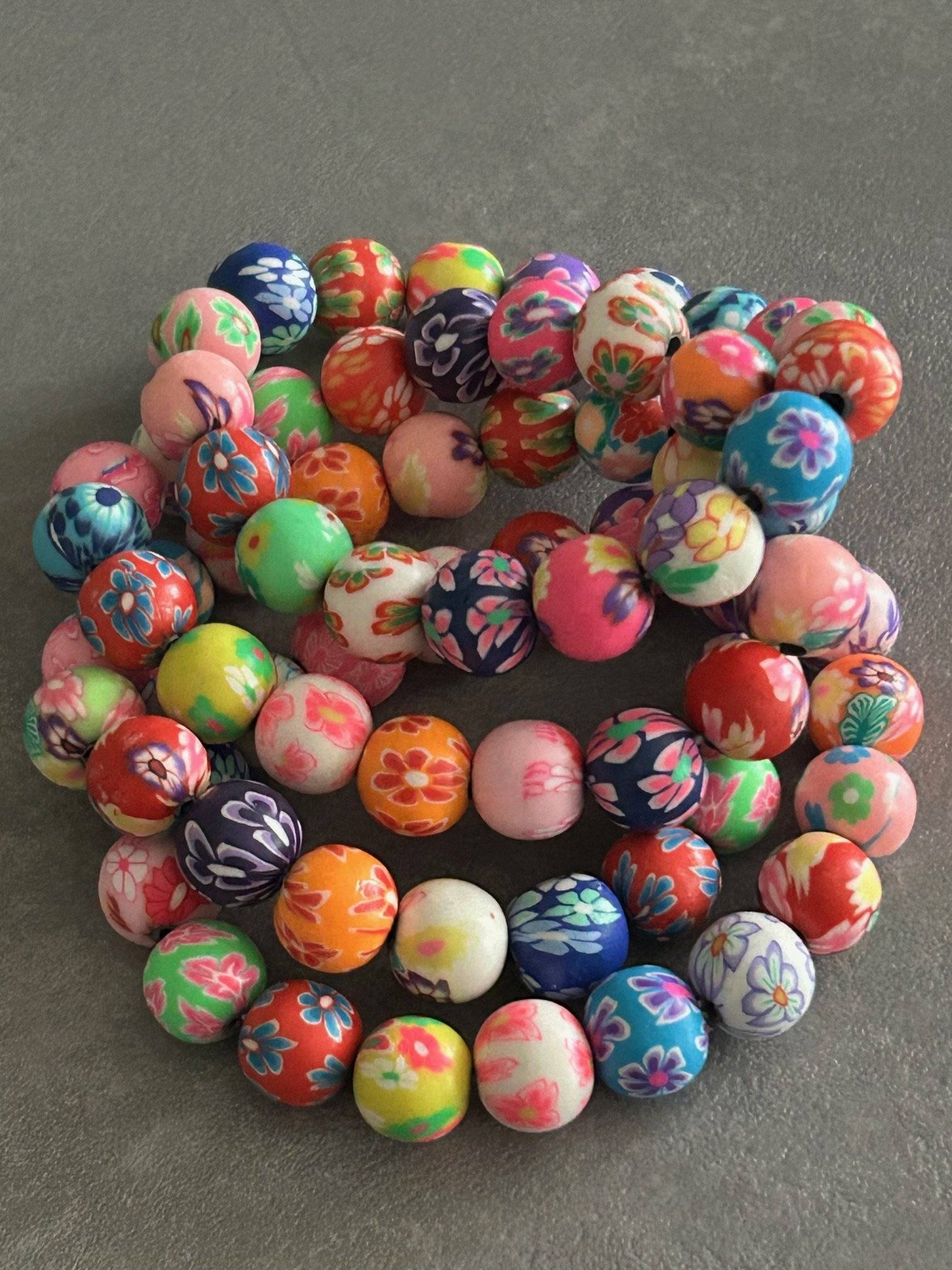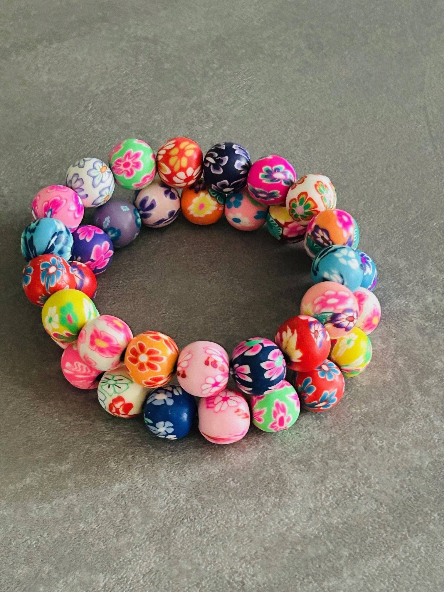 Set de 2 brățări colorate pentru fetițe drăgălașe, confecționate din bile FIMO de 10 mm, înșirate pe gută elastică.