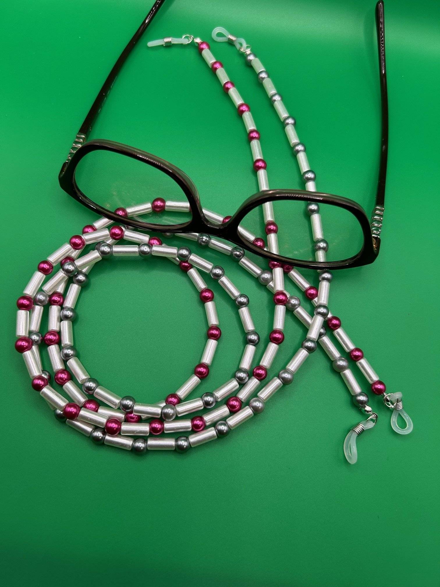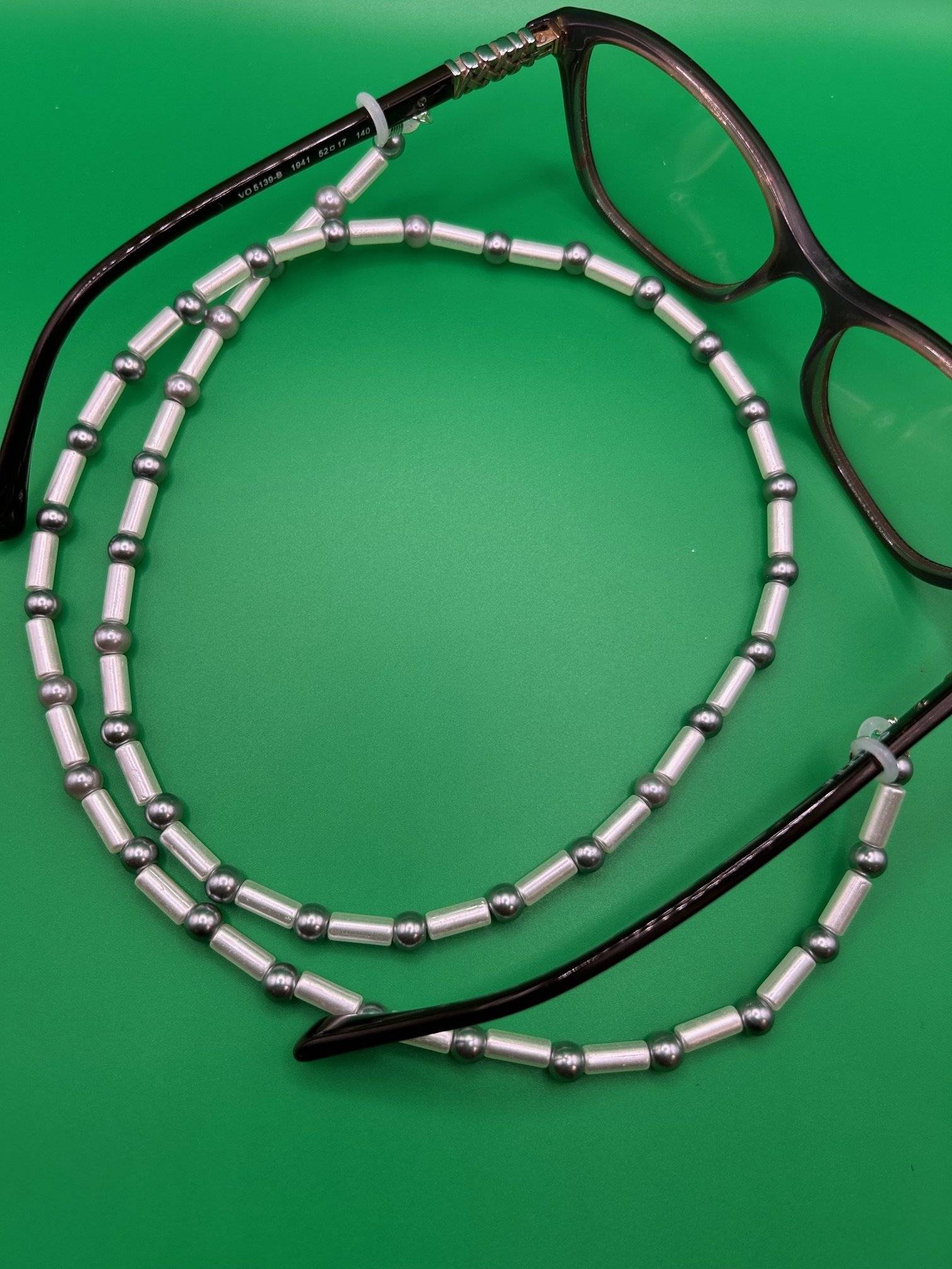 Set 2 lanțuri ochelari mărgele tubulare și perle grena și gri