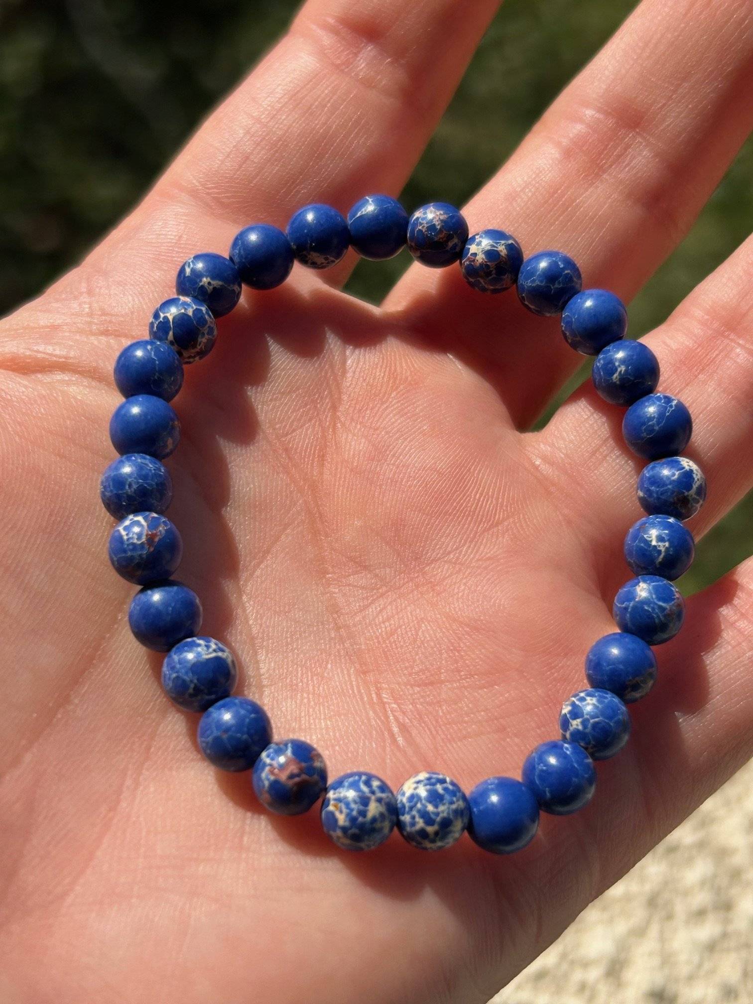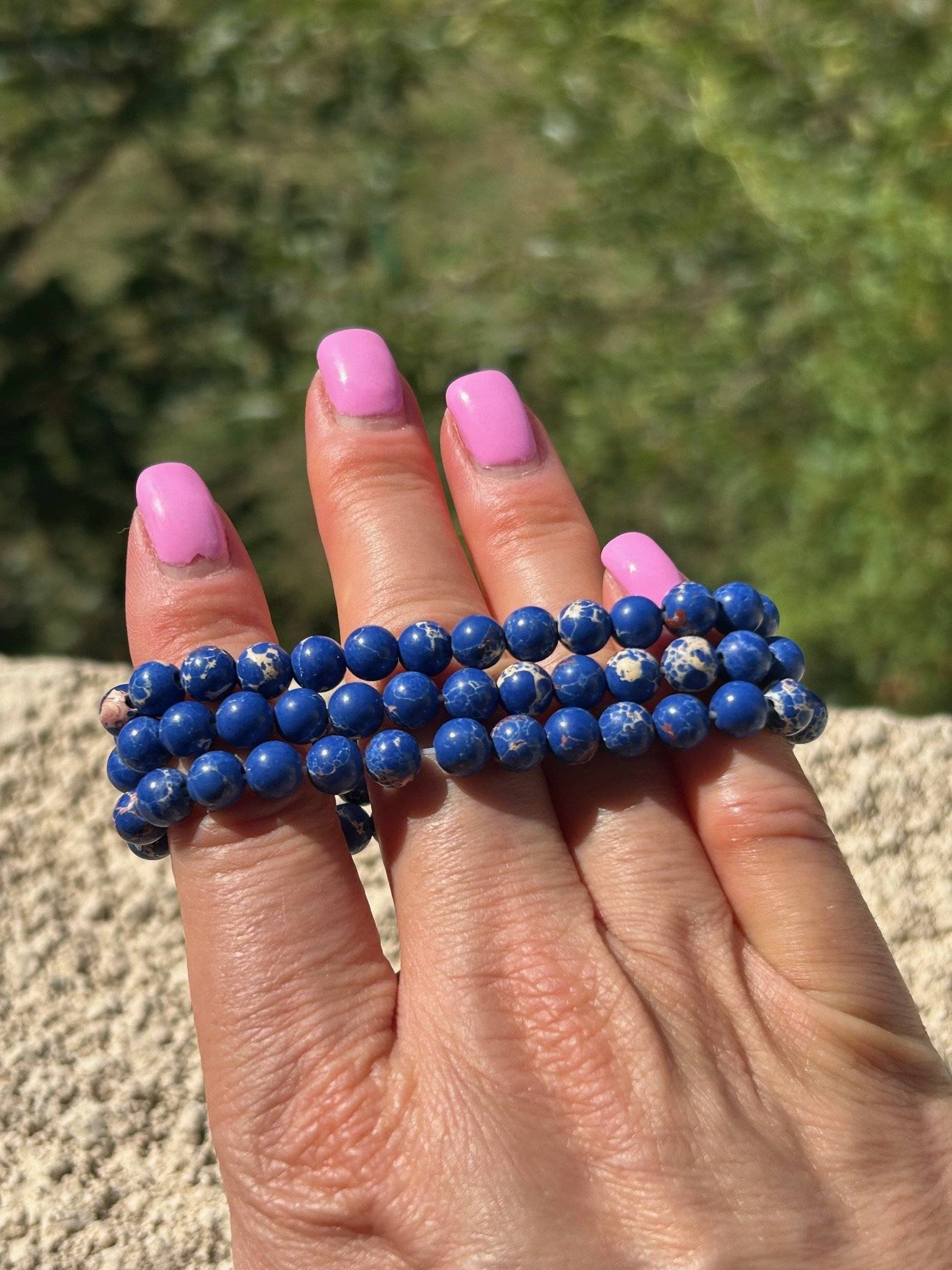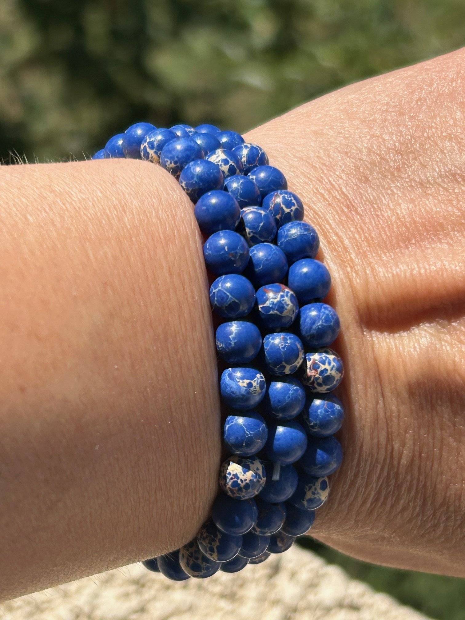 Set de 3 brățări drăgălașe, realizate din sfere de jasp albastru, cu dimensiunea de 6 mm, înșirate pe gută elastică.