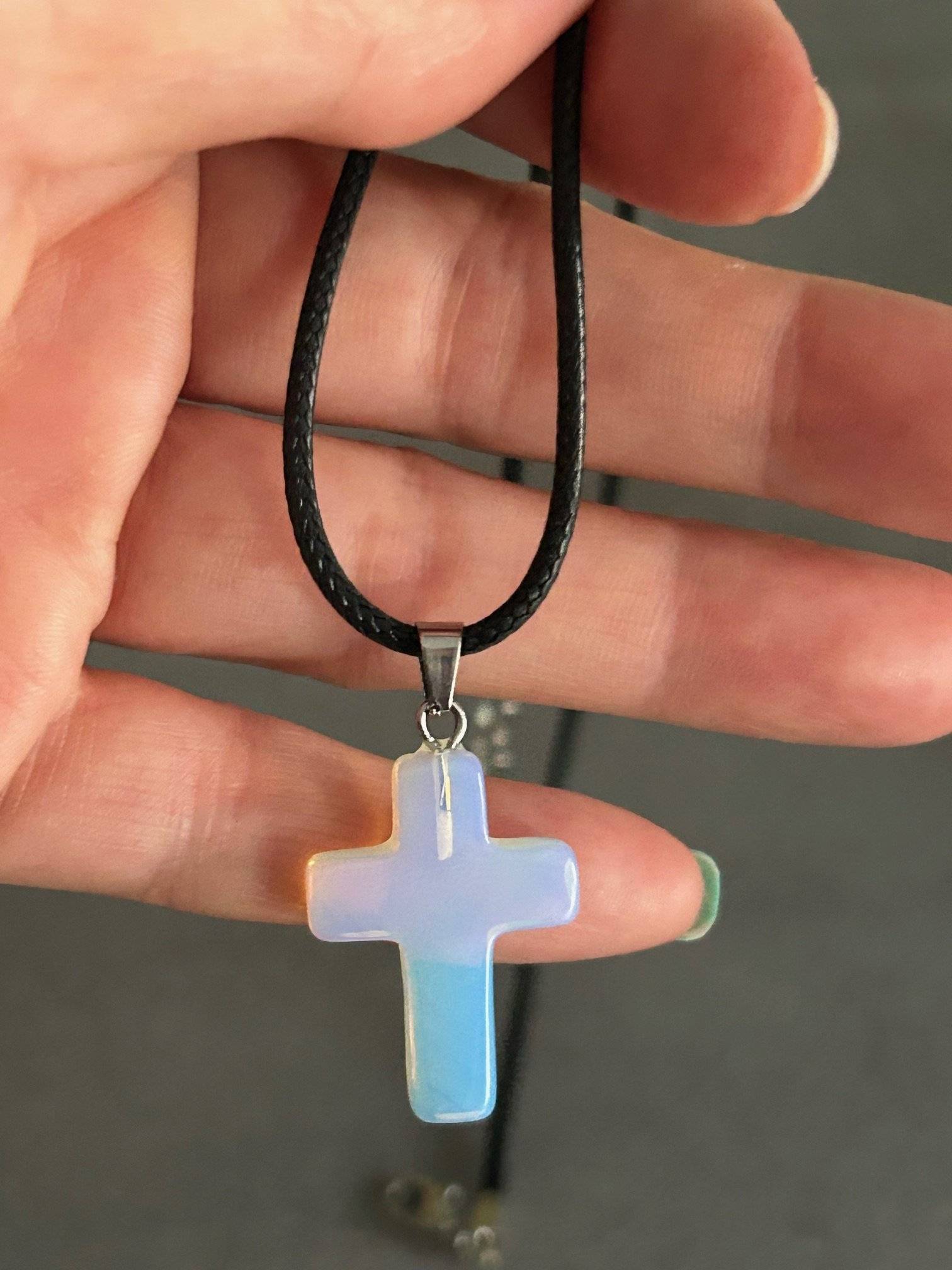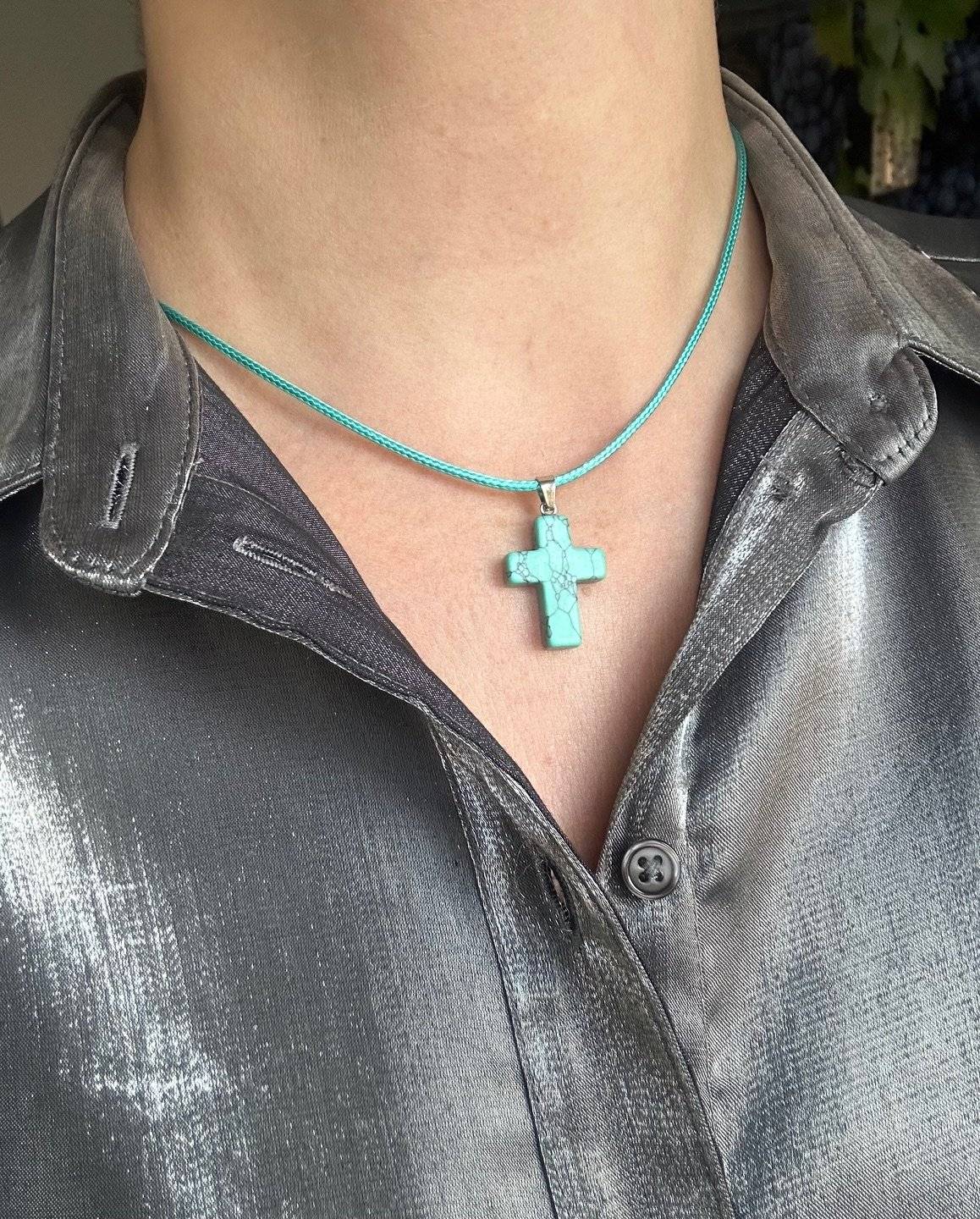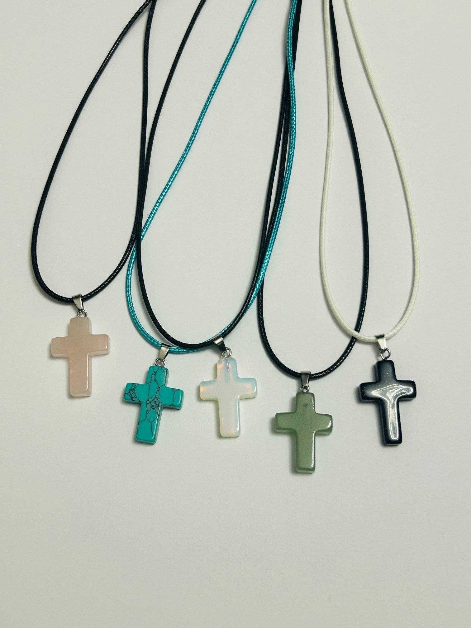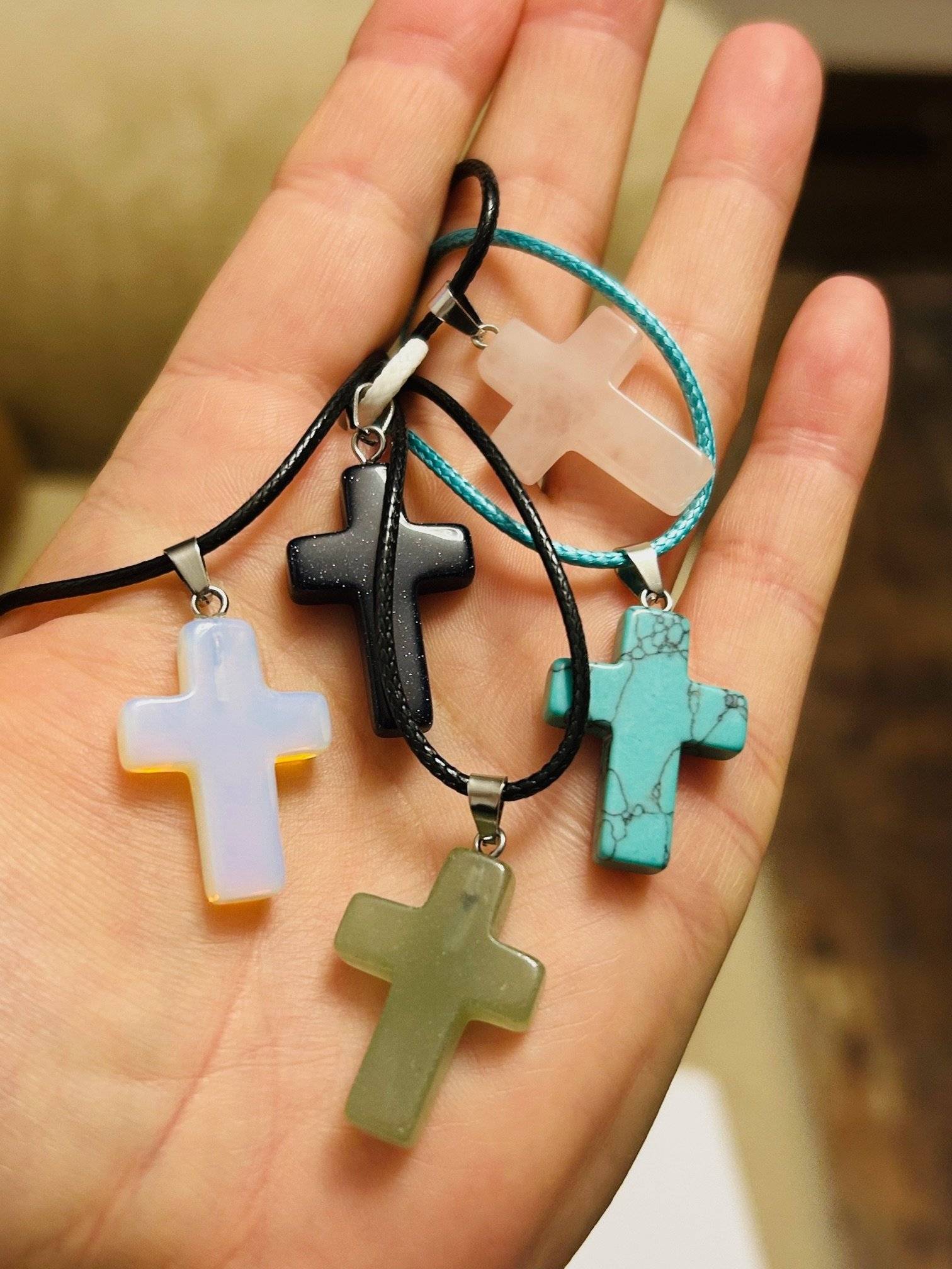 Set 5 pandantive cruciuliță din piatre semiprețioase aventurin verde, opalit, goldstone albastru, cuarț roz, turcoaz.