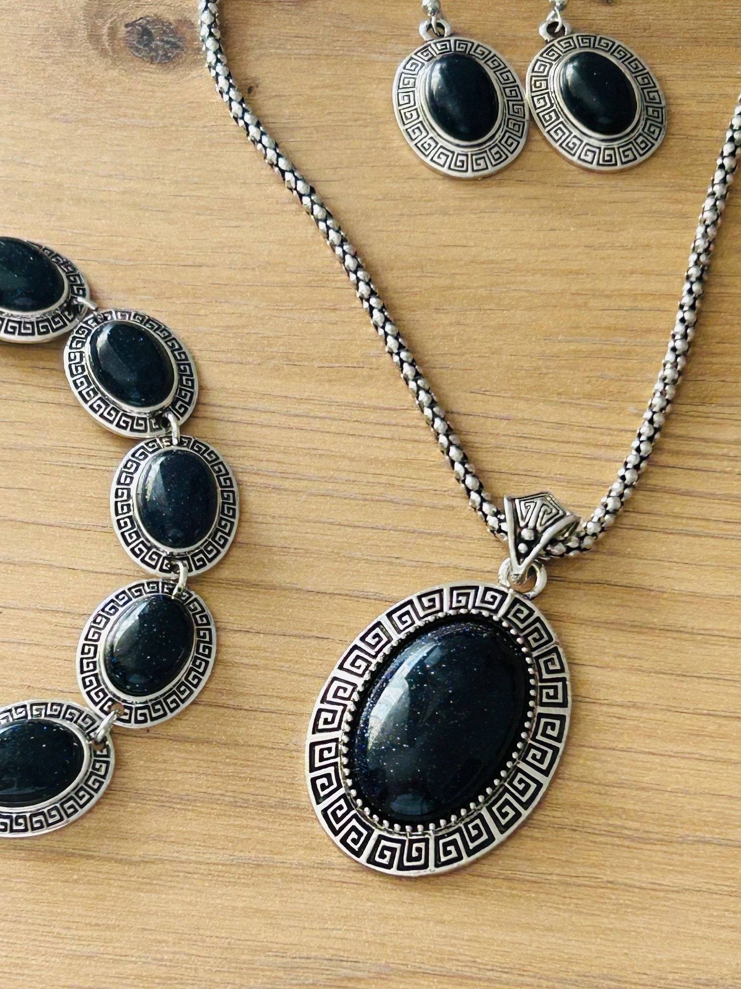 - lanț din aliaj inoxidabil cu pandantiv lacrimă - piatră sintetică Goldstone albastru. Lungime lanț 60 cm.