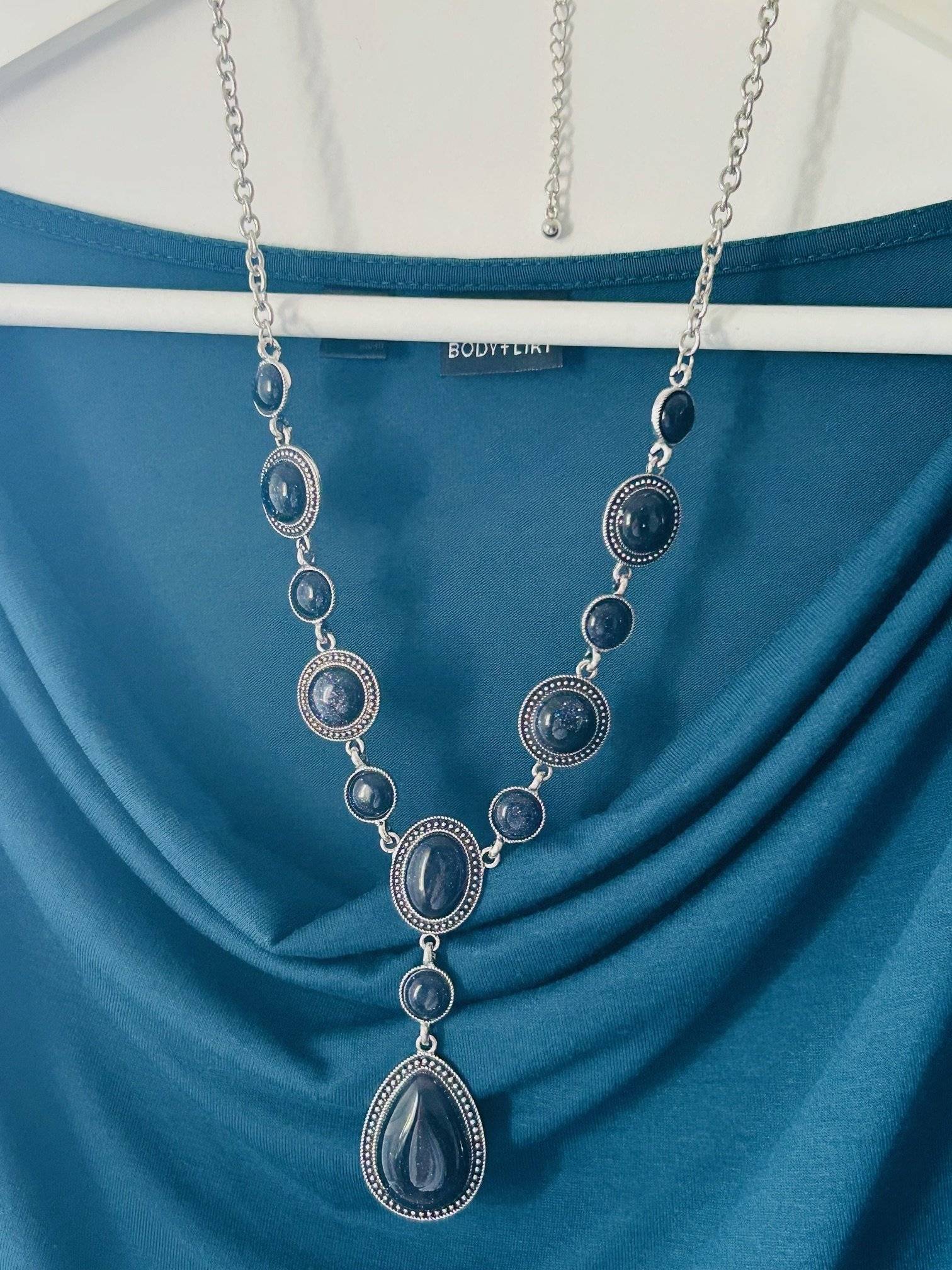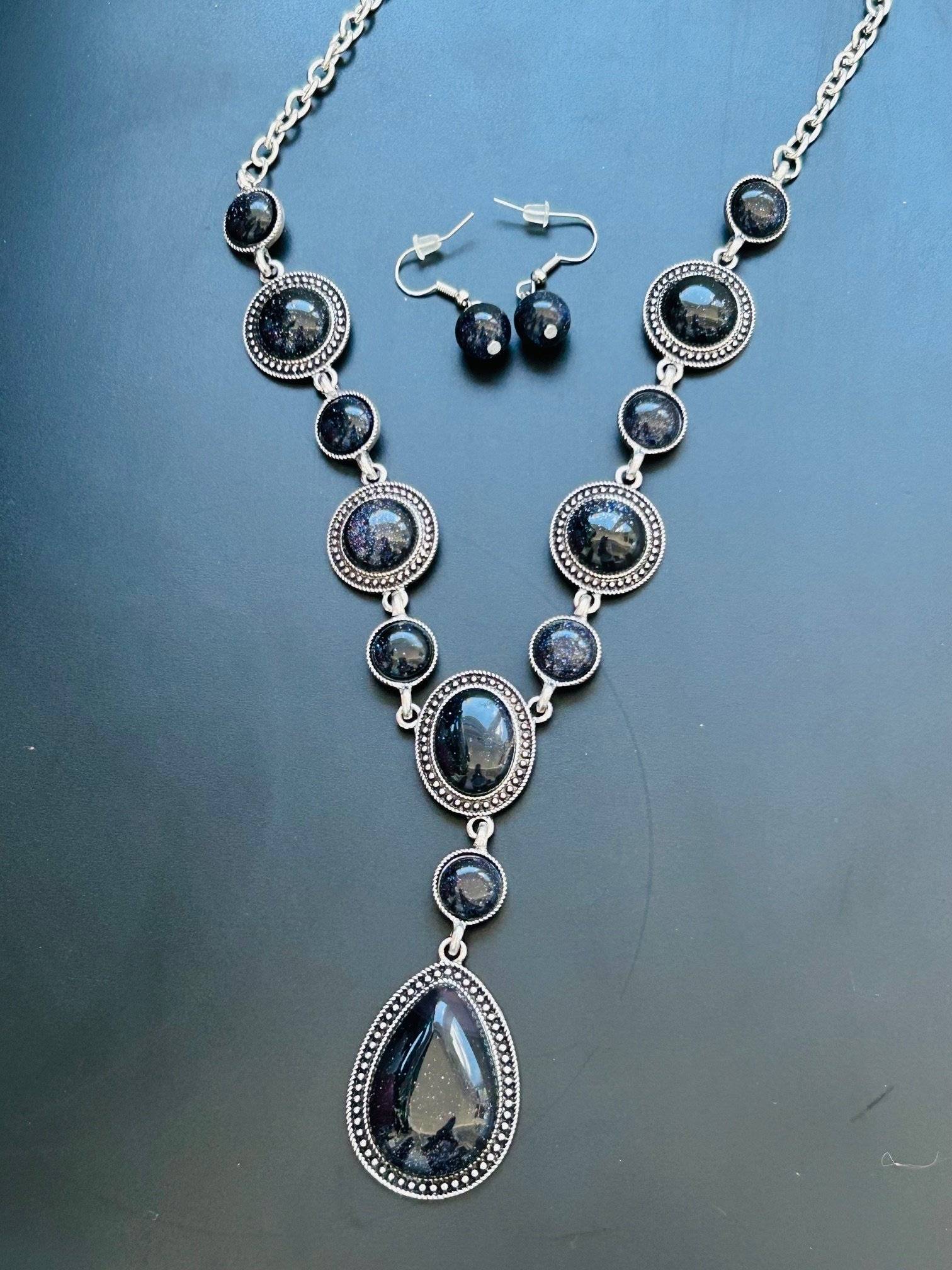- lanț din aliaj inoxidabil cu montură pietre - GOLDSTONE ALBASTRU. Lungime lanț 60 cm.