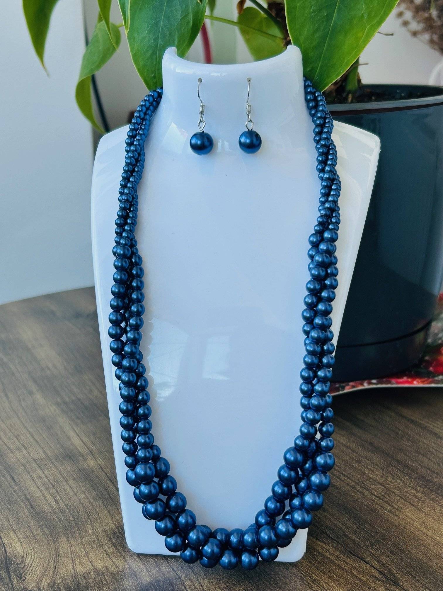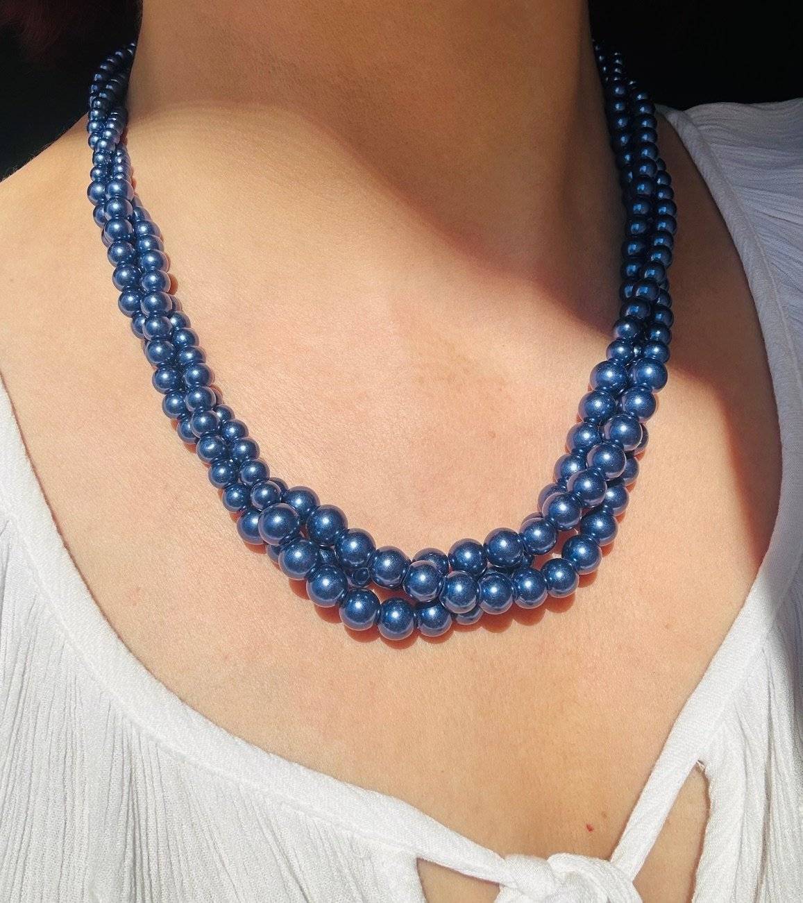 - colier din perlă sticlă, sfere intre 6 și 10 mm, culoare bleumarin. Lungime 42 cm, închidere lobster cu lănțișor prelungitor.