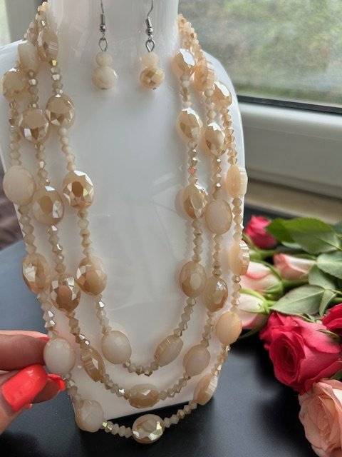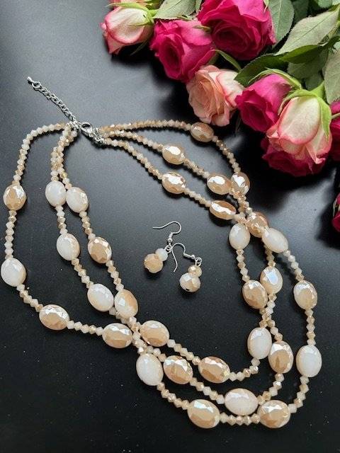 - colier din cristale fațetate mari ovale, cu dimensiunea de 25x18 mm și cristale mici biconice 4x3 mm, culoare bej. Lungime 42 cm, închidere lobster cu lănțișor prelungitor.
