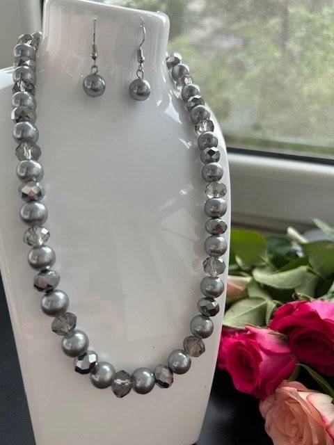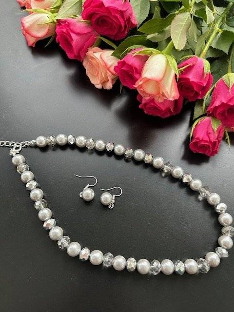 - colier din perlă sticlă, sfere de 8 mm și cristale fațetate, cu dimensiunea de 10x8 mm, culoare gri deschis. Lungime 42 cm, închidere lobster cu lănțișor prelungitor.